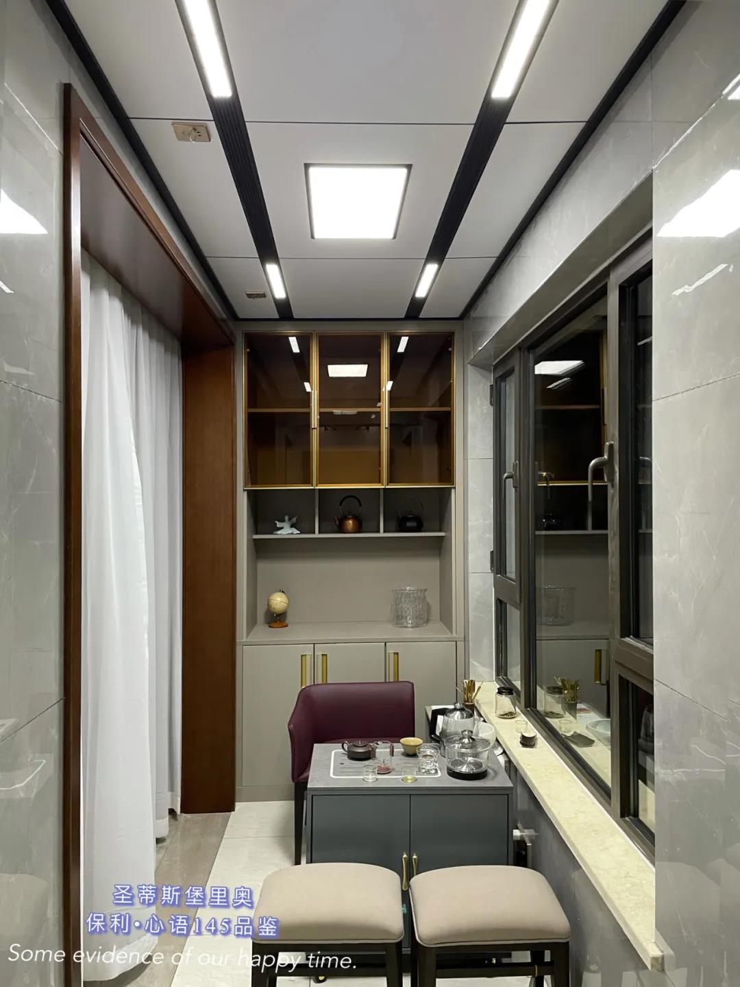 ▲餐厅一面及顶的透明柜体,以简练的金属线条分割出收纳空间,让立面视觉更显精致干净。餐边柜设置了台面、全玻璃展示区以及隐藏收纳区,满足了日常生活中多样的收纳需求。