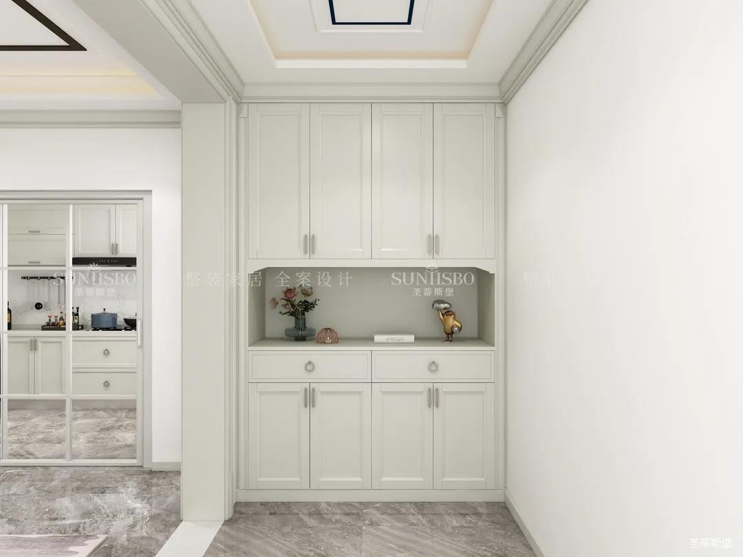 玄关整体遵循了对称美的设计,仿古白柜体在留白区域的衬托下,产生了若隐若现的隐形美。柜体储物功能强大,中空部分可以放置入户零碎物品。贴心的设计让出入户随即变得方便又舒适。