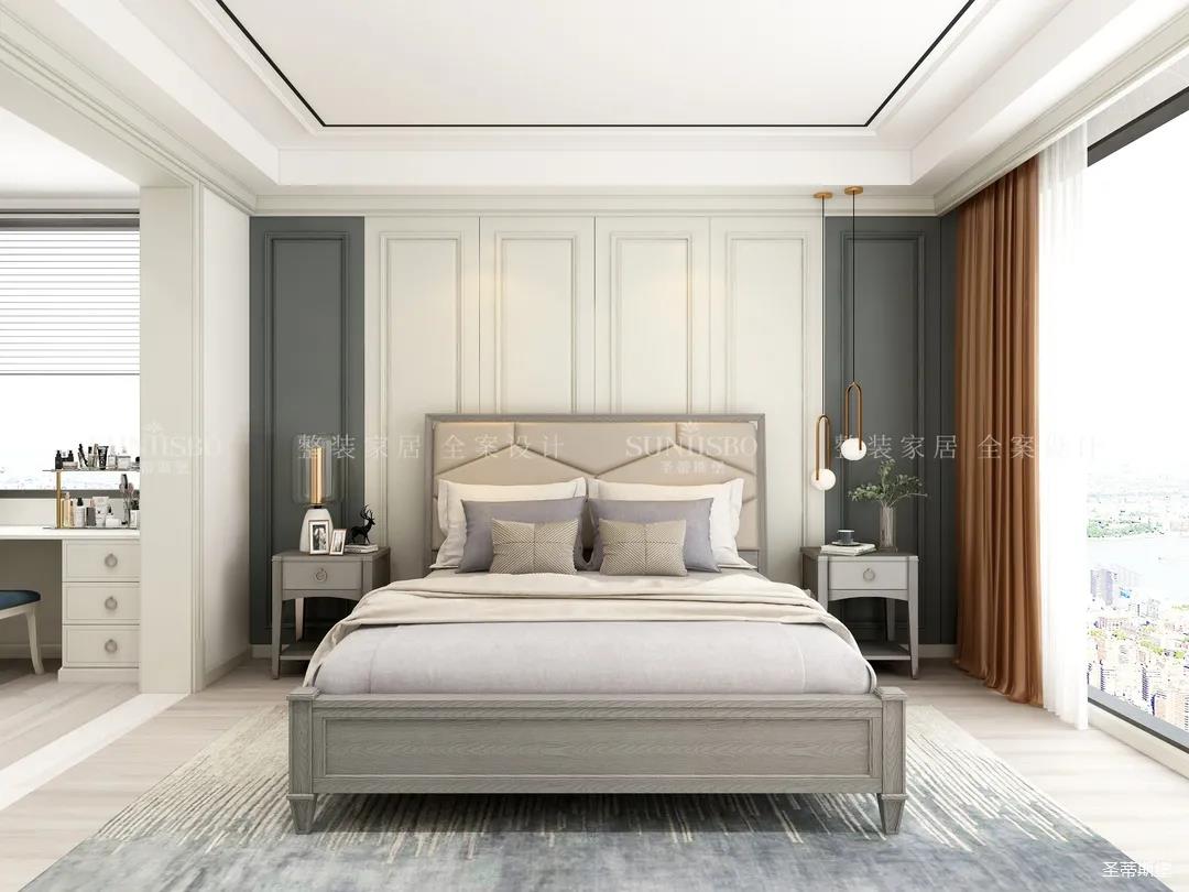 轻盈而明亮的实木饰面与超大落地窗,给次卧空间带来了明朗的空间视野,莫兰迪色彩交叠出最时尚的空间底色。定制衣柜对称开合让空间秩序规律又齐整,护墙选择了浅蓝色打底,虽是美式风格,颜色却没有美式的厚重感,印花贴合着床屏,流线简练利落,以简致的维度诠释着美式雅致的舒适生活。